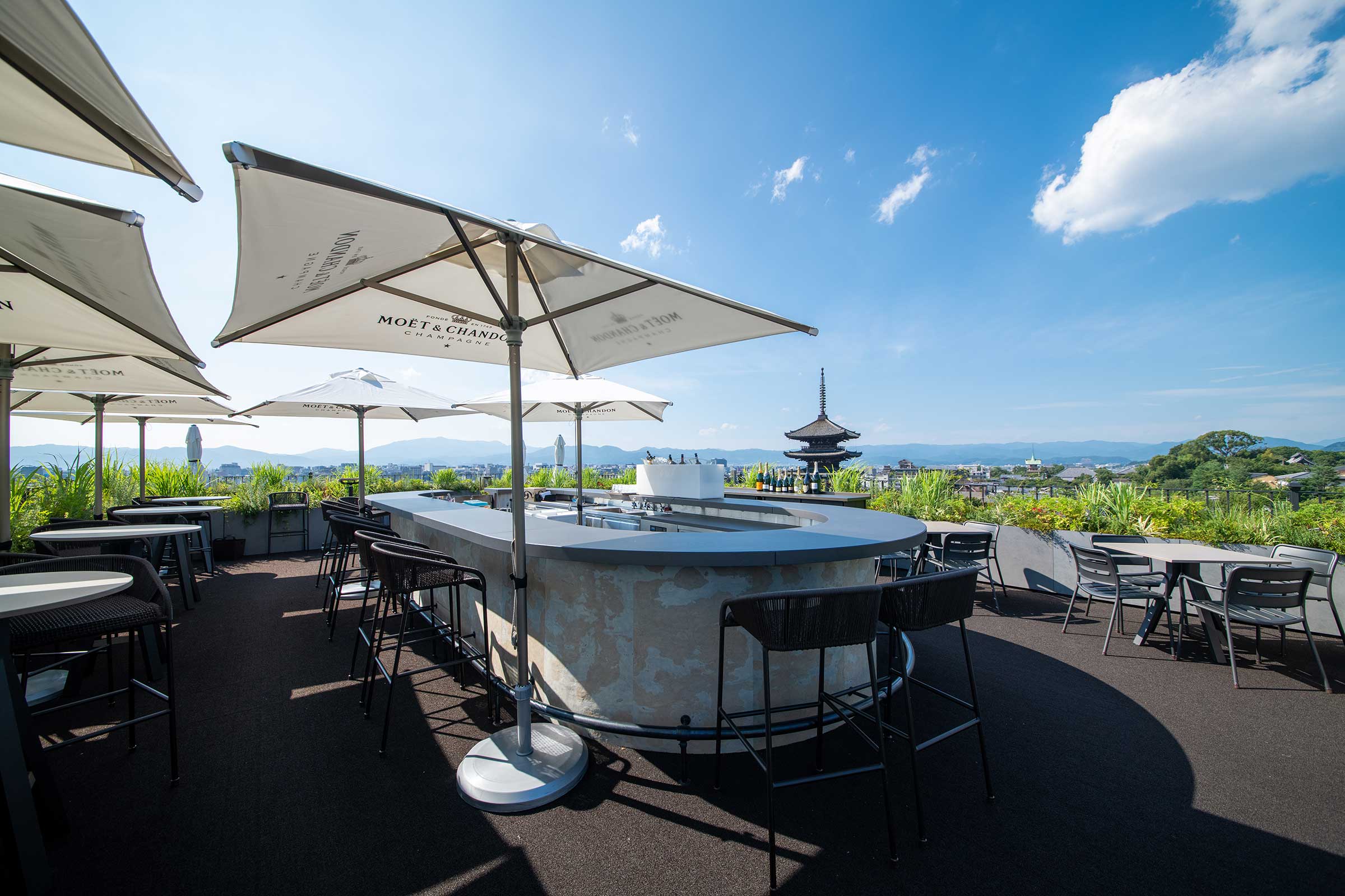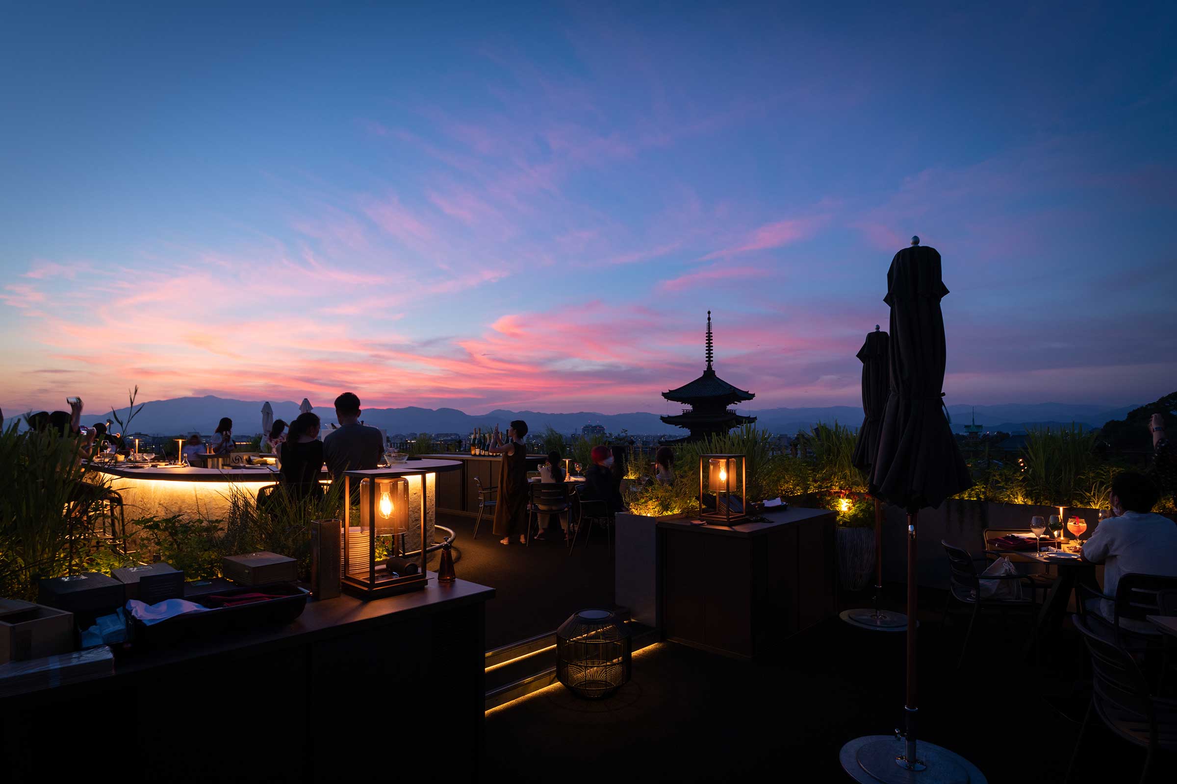 K36は、宿泊者およびビジターもご利用可能な「ザ・ホテル青龍 京都清水」のルーフトップバー&レストラン・メインバー。バー最大の魅力は、京都市街が一望出来る360度のパノラマビューです。広大な敷地のルーフトップバーからは、京都の街並みに沈む夕陽を堪能することができ、夜になると目の前に広がる法観寺・八坂の塔の眺望もお楽しみいただけます。洗練された大人の空間で垂涎の美酒をご堪能ください。